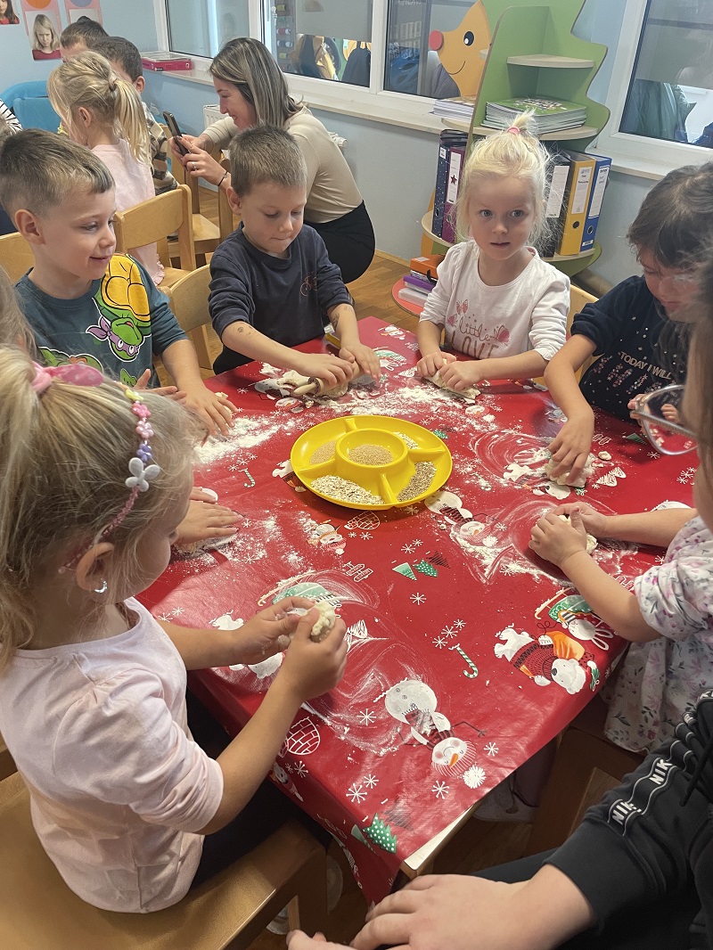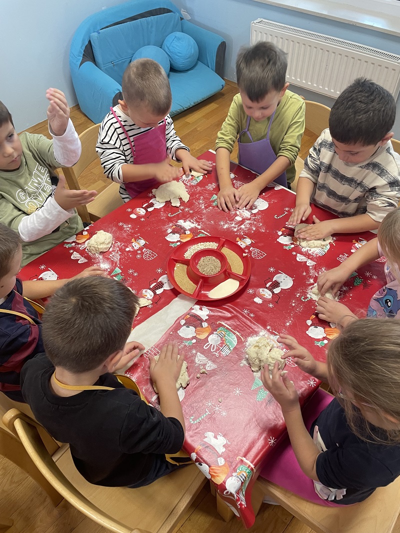 Dane kruha obilježili smo radionicom s roditeljima u ugodnom i veselom ozračju. Djeca su s velikim zanimanjem izrađivala različite oblike od slanog tijesta učeći pritom kako se pravi i oblikuje tijesto koristeći maštu. Radionica je djeci omogućila razvoj fine motorike, suradnje i strpljenja, te je potaknula njihovu kreativnost i samopouzdanje jer su mogli vidjeti rezultate svog rada. Roditelji su bili uključeni kao pomoć i poticaj, a djeca su pokazala veliko oduševljenje i ponos na svoj rad. Radionica je protekla u duhu zajedništva, suradnje i radosti stvaranja što je dodatno obogatilo iskustvo roditelja i djece.